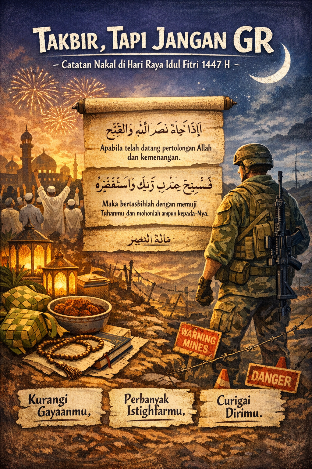 Takbir menggema. Grup WhatsApp mendadak alim. Status medsos penuh maaf lahir batin, seolah dosa bisa di-clear cache dengan satu klik dan satu caption bijak. Baju baru rapi. Wajah kinclong. Hati? Ya… kita doakan ikut kinclong juga, walau kadang masih buffering.